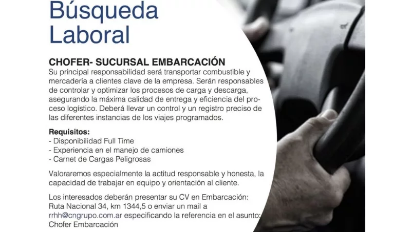 Son tiempos difíciles para conseguir trabajo no sólo en la Capital, sino en toda la provincia. Pero si vivís en el Norte, tenés una buena oportunidad de conseguirlo. El Grupo Combustibles del Norte, una empresa salteña con proyección regional, se encuentra en la búsqueda de choferes para su sucursal en Embarcación.