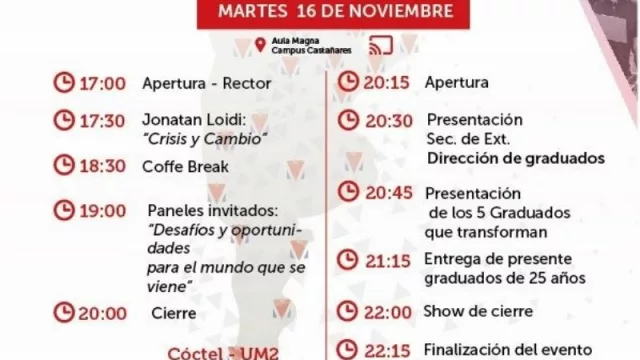 La jornada del 16 estará presidida por el disertante Jonatan Loidi, fundador y Director de Grupo SET, con foco en análisis y generación de Modelos de Negocios de alto rendimiento. En esta oportunidad estará disertando sobre su último libro “Crisis y cambio”. Además, habrá un panel interdisciplinario formado por graduados, empresarios y organizaciones sociales en el que se presentarán los principales desafíos del contexto en esta era de cambios, y a la vez los aportes de cada uno de los sectores para atender a las diferentes problemáticas sociales.