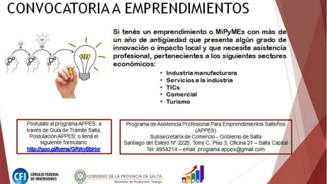 En los próximos días se pondrá en marcha la 8° edición del programa de Asistencia Profesional Para Emprendimientos Salteños (APPES). Se trata de una iniciativa de la Subsecretaría de Comercio del Ministerio de Producción, que ya abrió la convocatoria para que se sumen emprendedores y estudiantes avanzados.