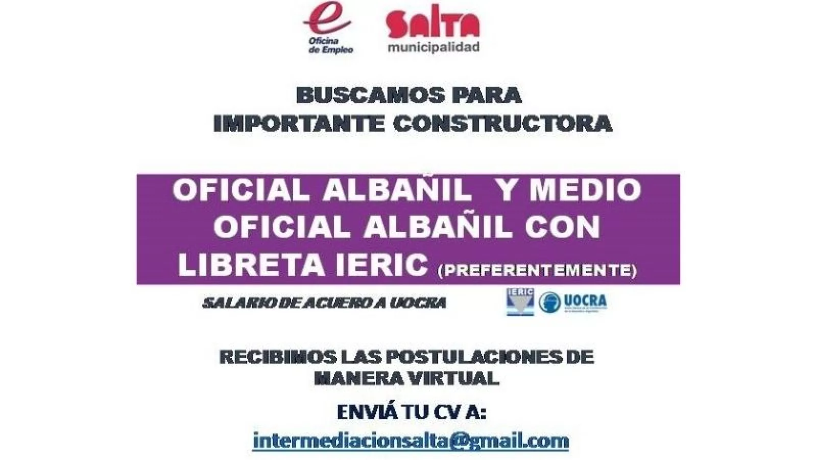 La búsqueda laboral está a cargo de la oficina de Empleo, perteneciente al Ente de Desarrollo Económico. Se requiere para una destacada empresa 10 puestos de oficial albañil y 10 medio oficial albañil.