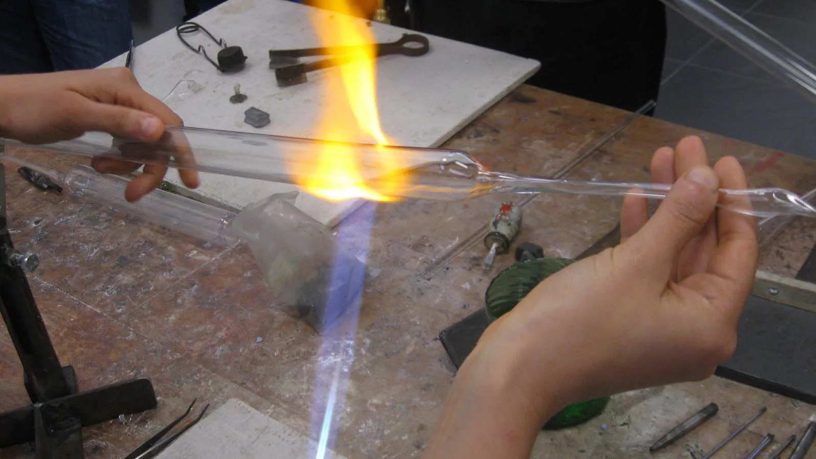 Nivel 1: Viernes 25 de julio, destinado a principiantes. Se aprenderá a hacer hilos, gotas, medallas y gemas de vidrio. Familiarización con el uso del equipo (oxígeno-gas) y medidas de seguridad. Compatibilidad entre vidrios y preparación de los materiales a trabajar.