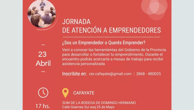 ¿Tenés un emprendimiento o pyme en los Valles Calchaquíes? ¿Querés invertir para mejorarlo? El próximo lunes 23 vas a tener la oportunidad de reunirte con información que te ayude a concretar tus sueños. Ese día a partir de las 15.30, en el SUM de la Bodega de Domingo Hermano de Cafayate, se desarrollará una Jornada de Atención a Pyme.