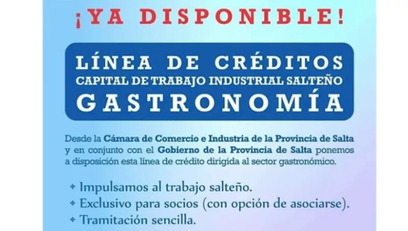 “En un esfuerzo por impulsar el trabajo salteño y mediante una tramitación sencilla, este beneficio exclusivo para socios (y emprendedores con opción a asociarse) ya se encuentra disponible a través de la Cámara de Comercio e Industria de Salta que coordina el beneficio con la Cámara Hotelera Gastronómica y Afines de Salta”, explicaron desde la entidad quienes explicaron que mediante un acuerdo con el Gobierno, la Cámara evalúa a los postulantes a acceder a créditos con tasa subsidiada a bajo costo.