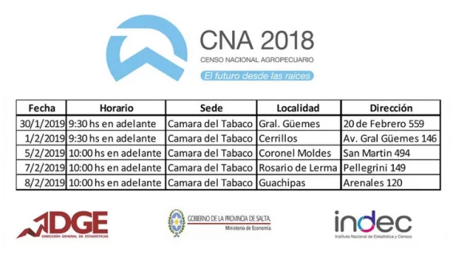 El trabajo de campo del Censo Nacional Agropecuario 2018 está terminado, pero muchos productores no fueron relevados por los censistas, en especial en la zona del Valle de Lerma. Debido a ello, la Dirección General de Estadísticas (DGE) informó que se dispuso un cronograma de atención para los productores que se encuentran esa situación. En este caso, la atención se realizará en oficinas que la Cámara del Tabaco tiene en Cerrillos, Güemes, Coronel Moldes, Rosario de Lerma y Guachipas.