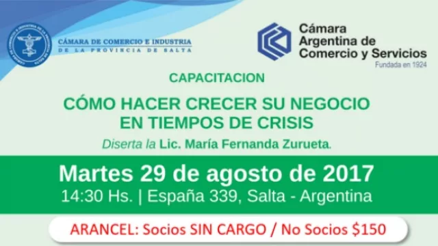 El comercio salteño viene de enfrentar meses muy difíciles, y desde la conducción de la Cámara de Comercio e Industria de Salta organizaron una conferencia para brindarles herramientas a aquellos asociados que la están pasando peor. La capacitación lleva por título “Cómo hacer crecer su negocio en tiempos de crisis”, y se dictará mañana a partir de las 14.30 en la sede de la institución, en España 339. La disertante es María Fernanda Zurueta, especialista de la Confederación Argentina de la Mediana Empresa (CAME); y la actividad no tiene costo para los socios, aunque los no socios deberán abonar un arancel de 150 pesos.