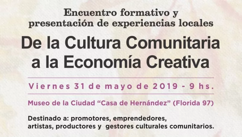 “De la Cultura Comunitaria a la Economía Creativa”. Ese es el título de un encuentro formativo y presentación de experiencias locales que se llevará a cabo hoy a partir de las 9 en el Museo de la Ciudad Casa de Hernández (La Florida 97), organizado por la Subsecretaría de Cultura de la Municipalidad de Salta.