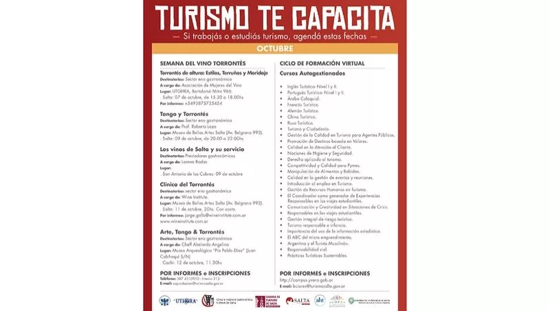 Durante octubre continuarán las capacitaciones gratuitas de formación para prestadores turísticos organizadas por el Ministerio de Cultura, Turismo y Deportes junto a las cámaras y sindicatos del sector. Este mes las capacitaciones se dictarán en Seclantás, Cachi, ciudad de Salta, Cafayate, San Carlos, Orán, Tartagal y San Antonio de los Cobres.