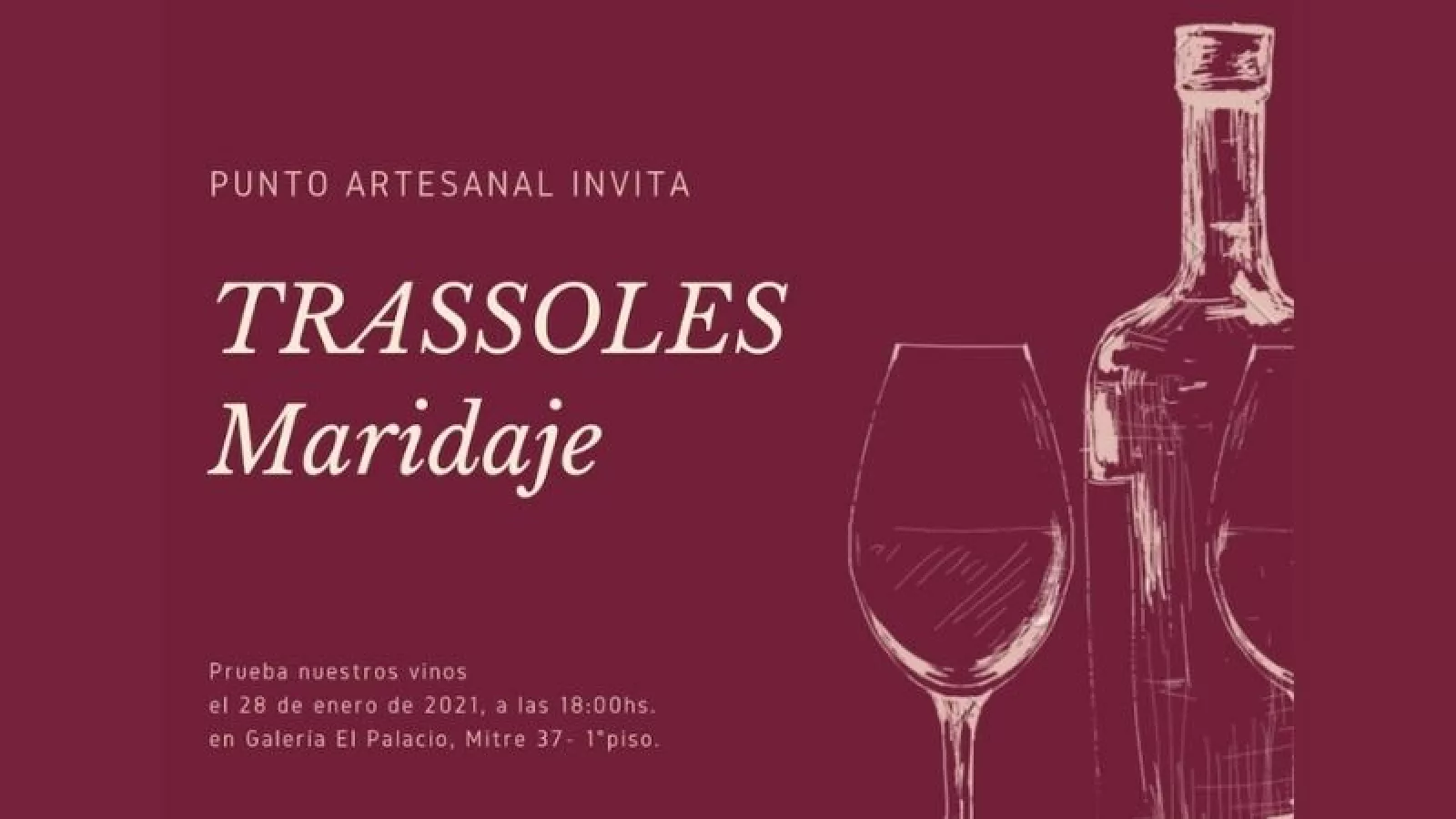 En la feria Punto Artesanal que funciona en Mitre 37, primer piso de Galerías El Palacio, se realizará hoy jueves 28, a las 18 hs, una degustación-maridaje de las distintas variedades de vinos de la cooperativa vitivinícola Trassoles y se compartirá una selección gastronómica sazonada con condimentos de la Asociación de Pequeños Productores de Fuerte Alto de la localidad de Cachi. La entrada es gratuita y se llevará adelante bajo los protocolos sanitarios vigentes.