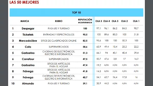 Dentro de estos datos recogidos, construyeron un top ten de marcas de origen local que son elegidas por los argentinos. La lista la encabeza Despegar, y le siguen MercadoLibre y Coto. En el caso de las compañías extranjeras, lidera el ranking Ticketek y le siguen Carrefour y Jumbo.