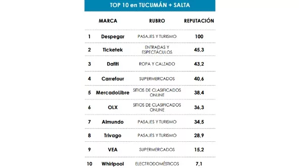En el caso de Tucumán y Salta, el top ten de marcas relevadas y elegidas por los habitantes del norte de nuestro país la encabeza Despegar y le siguen Ticketek y Dafiti. En cuarto y quinto puesto se ubican Carrefour y MercadoLibre. Los cinco restantes son OLX, Almundo, Trivago, VEA y Whirpool.