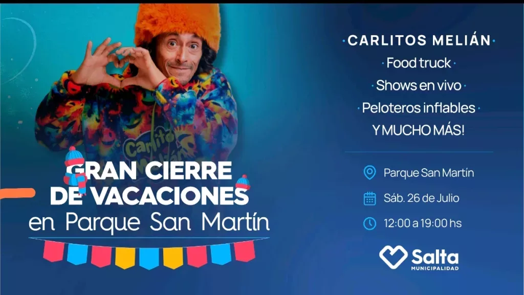 La Municipalidad de Salta invita a todas las familias de la ciudad, a disfrutar del Gran cierre de Vacaciones de invierno que se llevará a cabo este sábado 26, en el Parque San Martín de 12 a 19. La actividad contará con la presentación de Carlitos Melián, food trucks, juegos y una gran feria de emprendedores locales.