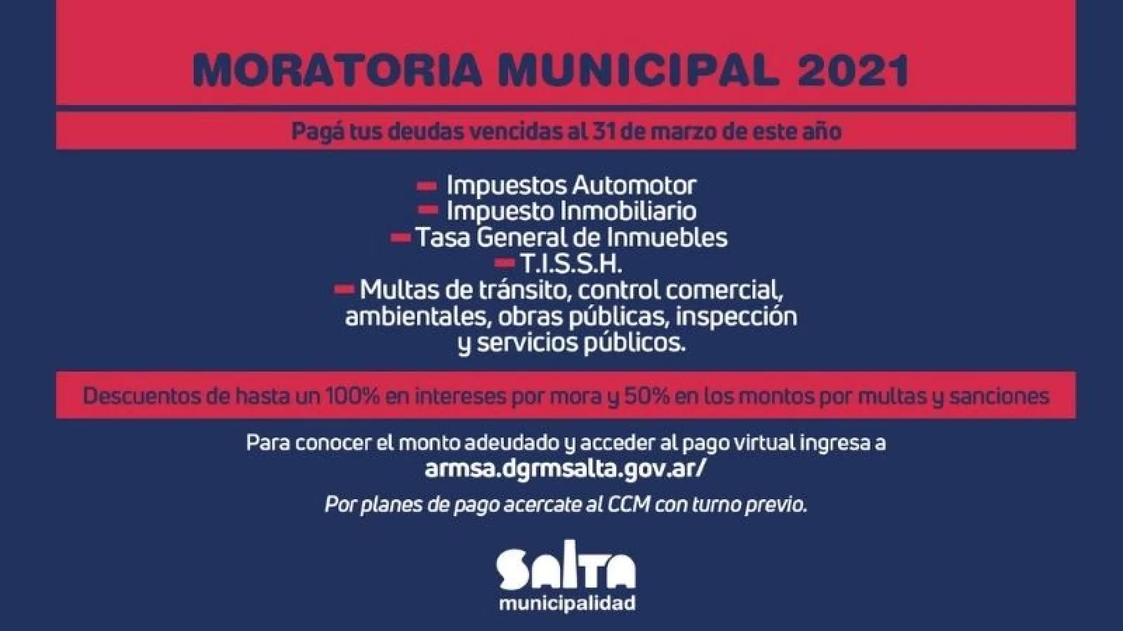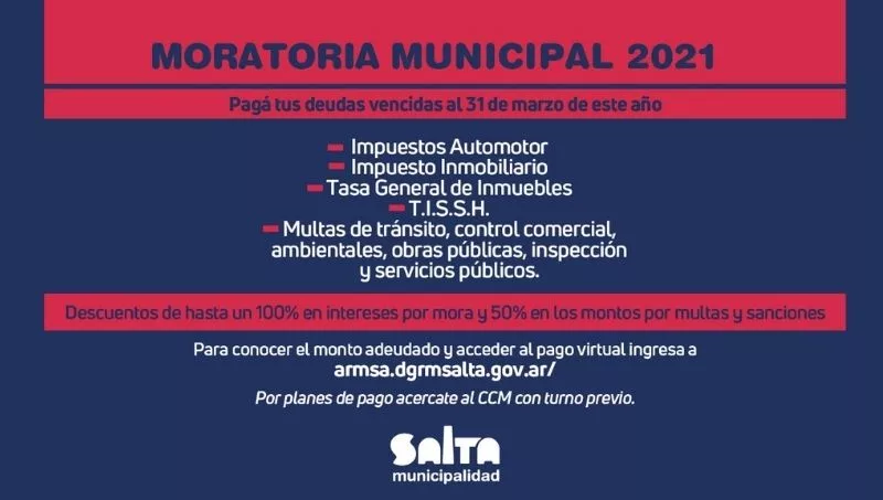 En caso de consulta digital por monto adeudado y pago on line, los contribuyentes deberán ingresar a armsa.dgrmsalta.gov.ar Allí deben elegir el tributo a consultar, para desplegar los detalles correspondientes a su deuda. Se recomienda a quienes quieran adherirse a este plan que lo hagan con tiempo y recordar que pueden incluir más de un tributo o multa municipal.