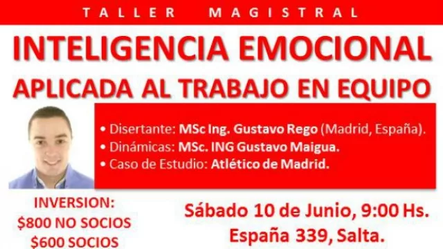 En el Salón de la Cámara de Comercio e Industria de Salta se dictará mañana a partir de las 9 un Taller Magistral denominado “Inteligencia Emocional aplicada al trabajo en equipo”, que estará a cargo del ingeniero español Gustavo Rego, con la participación de su colega Gustavo Maigua. La actividad tiene un costo de $ 800 para no socios y de $ 600 para socios de la institución, aunque se ofrece una promoción para grupos de 5 o más personas, para las cuales el costo es de $ 500.