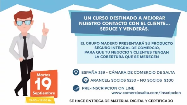 El curso se denomina “Atención Integral para nuestros clientes”, y tendrá como disertantes al licenciado Oscar Booth y a Patricia Serrano. De acuerdo a los organizadores, el curso está destinado a mejorar el contacto con el cliente, bajo la consigna: “seduce y venderás”. Simultáneamente el Grupo Madero presentará su producto Seguro Integral de Comercio, que brinda cobertura a los negocios y a los clientes.