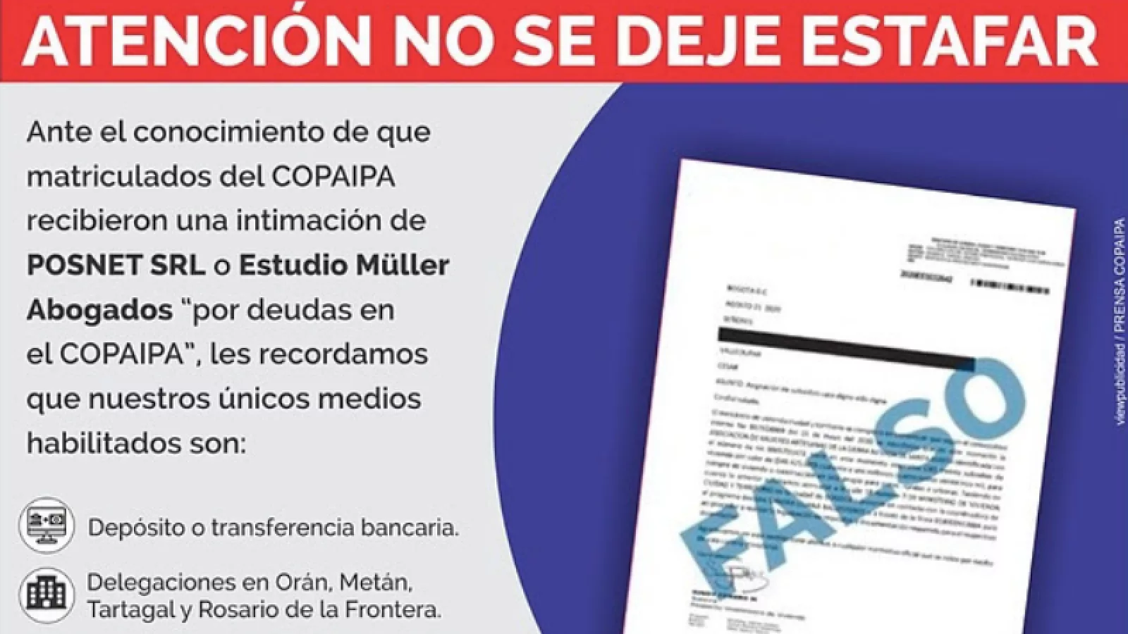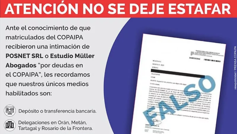 La comisión directiva del COPAIPA emitió un comunicado a sus matriculados con el objeto de alertarlos sobre estas acciones fraudulentas y les recordó que los únicos medios de pago son: