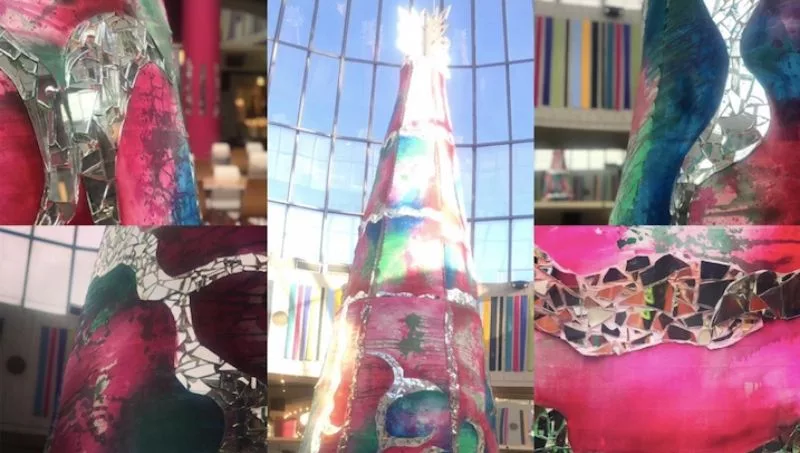 En esta oportunidad, Claudia Lamas intervino una estructura metálica de casi 8 mts. de altura, en la que, sobre lienzo de algodón, realizó la pintura y las incrustaciones de espejos.