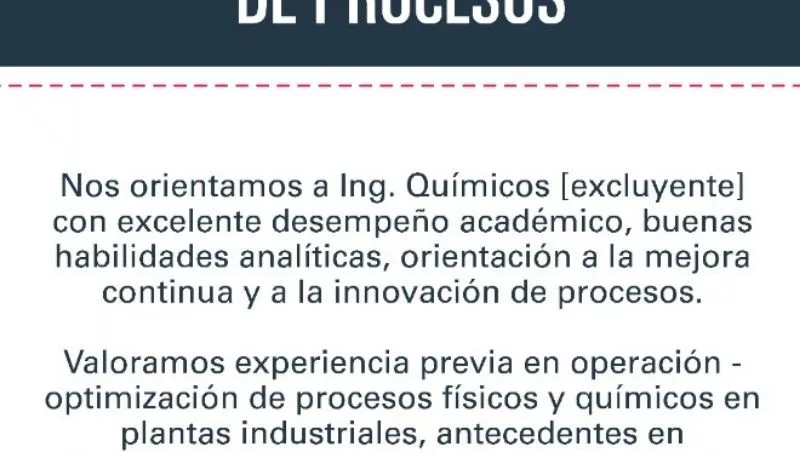 Livent incorpora ingeniero/a de Mejoras de Procesos. La búsqueda se orienta a ingenieros químicos (excluyente) con excelente desempeño académico, buenas habilidades analíticas, orientación a la mejora continua y a la innovación de procesos. Se valora la experiencia previa en operación, optimización de procesos físicos y químicos en plantas industriales, antecedentes en investigación, conocimiento de gestión de proyectos y buen manejo de idioma inglés. Localización: General Güemes.