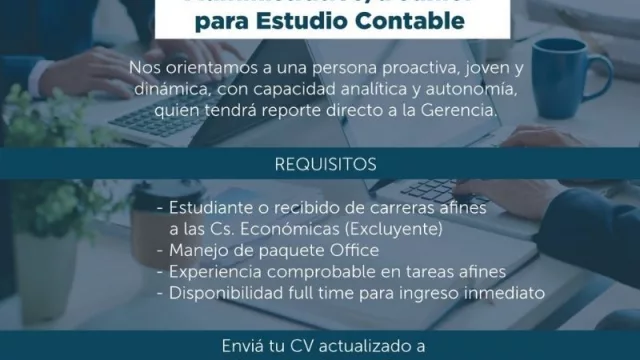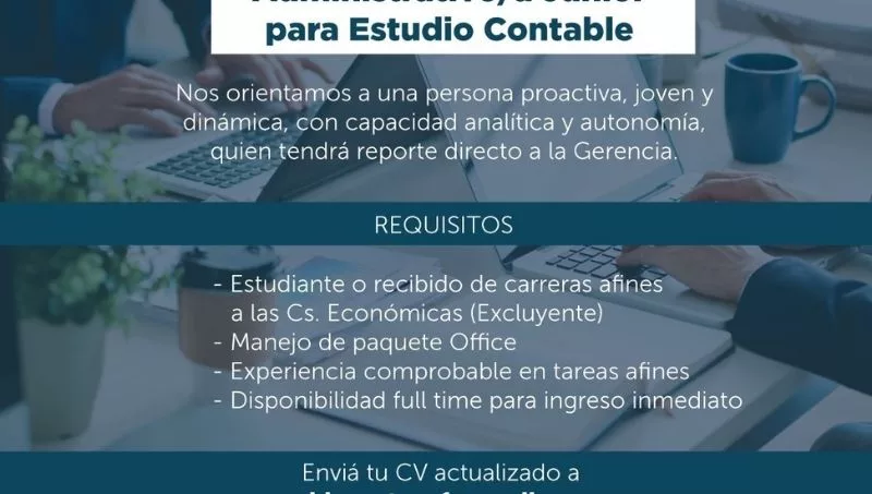 Norte Gestión y Finanzas necesita administrativo/a Junior para Estudio Contable. La búsqueda se orienta a una persona proactiva, joven y dinámica con capacidad analítica y autonomía, quién tendrá reporte directo a la Gerencia. Requisitos: estudiante o recibido de carreras afines a las ciencias económicas (excluyente); manejo de paquete Office. Experiencia comprobable en tareas afines y disponibilidad full time para ingreso inmediato.