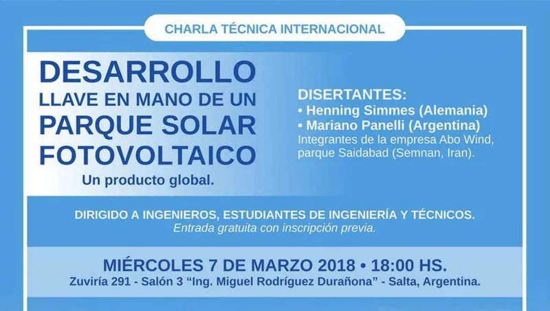 La Asociación de Ingenieros de Salta, consciente de esa necesidad, organizó para hoy una charla técnica titulada “Desarrollo llave en mano de un parque solar fotovoltáico – Un producto global”. La actividad estará a cargo de Henning Simmes, de Alemania; y Mariano Panelli, de Argentina; integrantes de la empresa Abo Wind, que gestiona el parque Saidabad, instalado en Semman, Irán. La actividad es gratuita con inscripción previa, y está dirigida a ingenieros, estudiantes de ingeniería y técnicos.