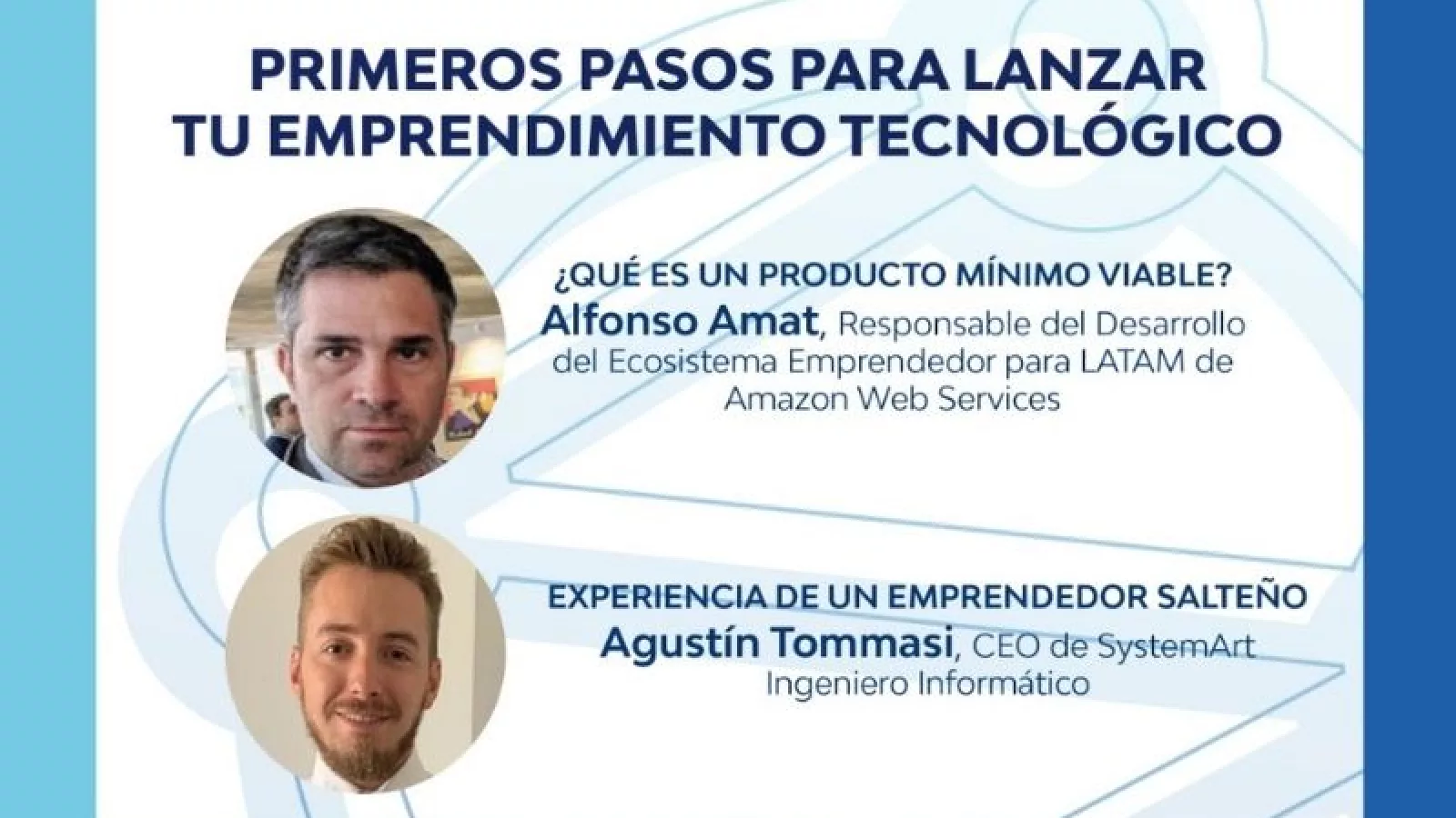 En esta oportunidad acompañará Alfonso Amat, Responsable del Desarrollo del Ecosistema Emprendedor para LATAM de Amazon Web Services, y Agustín Tommasi, emprendedor tecnológico salteño y CEO de SystemArt.