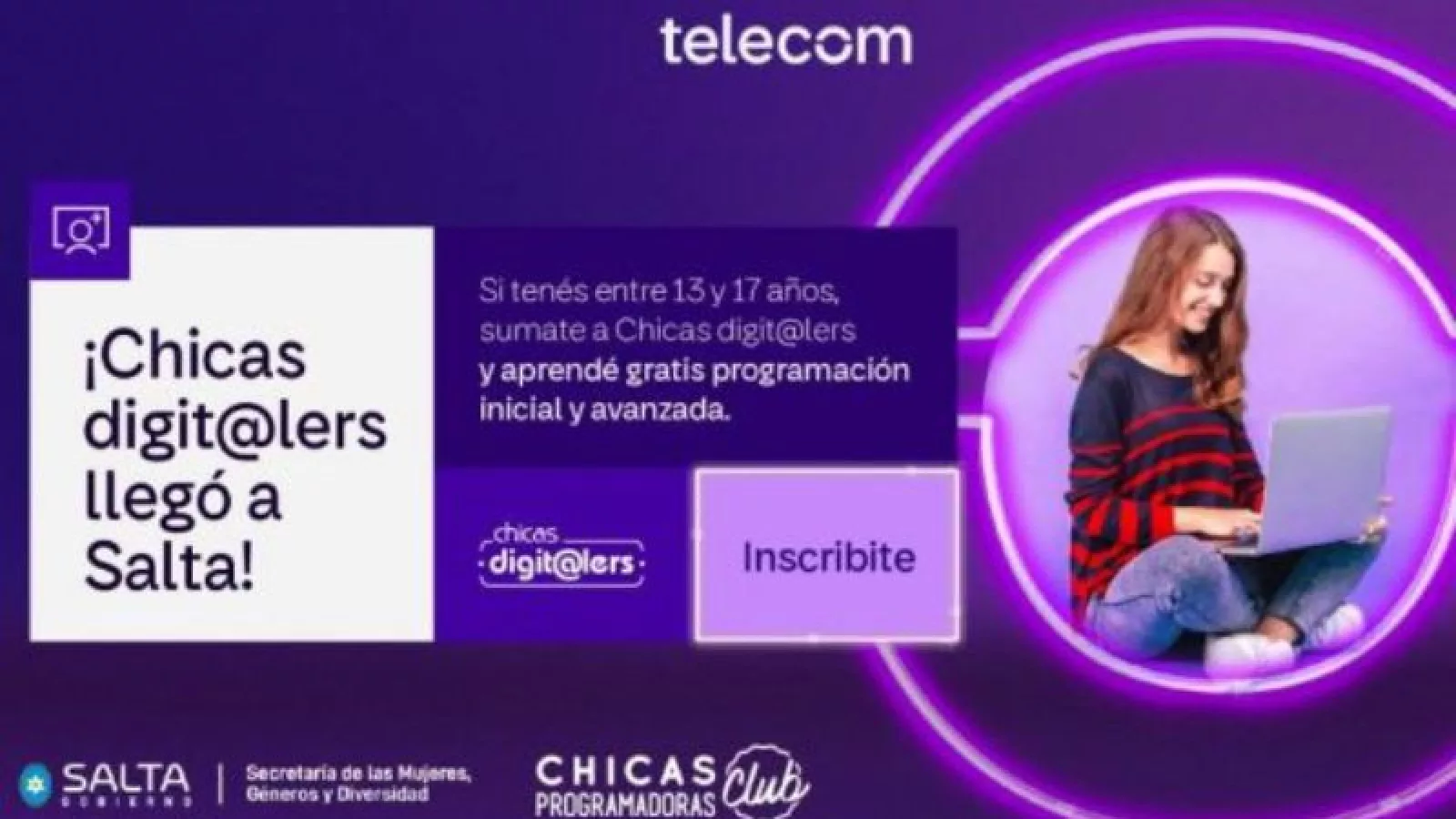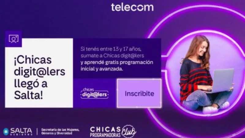 Hasta mañana se podrán inscribir las adolescentes salteñas, de entre 13 y 17 años, interesadas en sumarse al programa lanzado por Telecom con cursos gratuitos de programación y tecnología. Se trata de “Chicas digit@lers en Salta” que tiene cupos limitados: las inscripciones deben realizarse ingresando a en https://bit.ly/3zl7y7E.