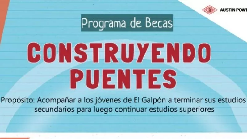 La empresa Austin Powder Argentina, cuya planta industrial se encuentra próxima a la localidad de El Galpón, lanzó esta semana el programa de becas Construyendo Puentes que está destinada a los estudiantes de El Galpón y El Tunal que cursan el último año del secundario. Se otorgarán 5 becas, 2 por cada establecimiento de El Galpón y 1 por el establecimiento de El Tunal, con el fin de acompañar a los jóvenes a terminar sus estudios secundarios, para luego poder continuar estudios superiores.