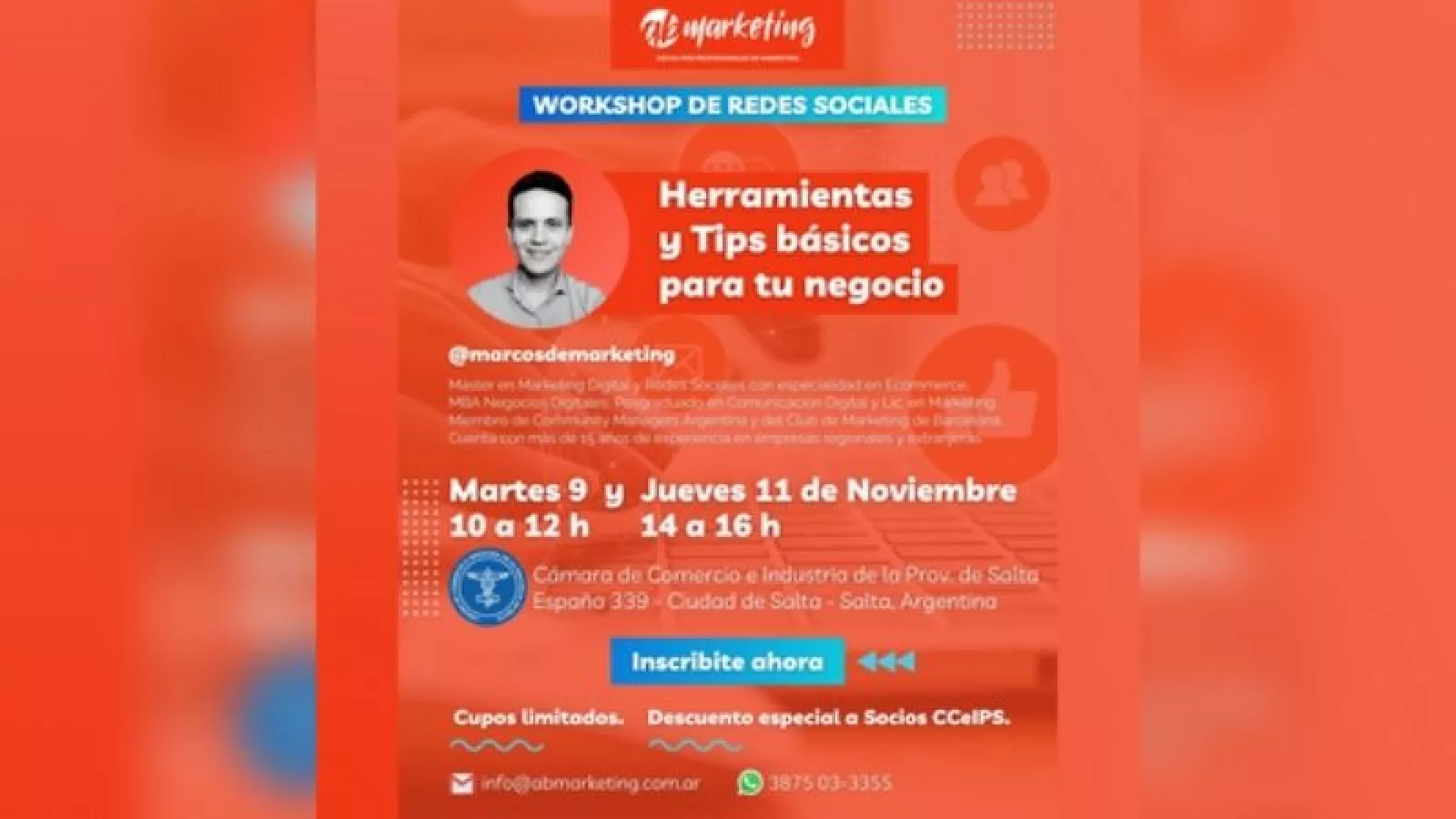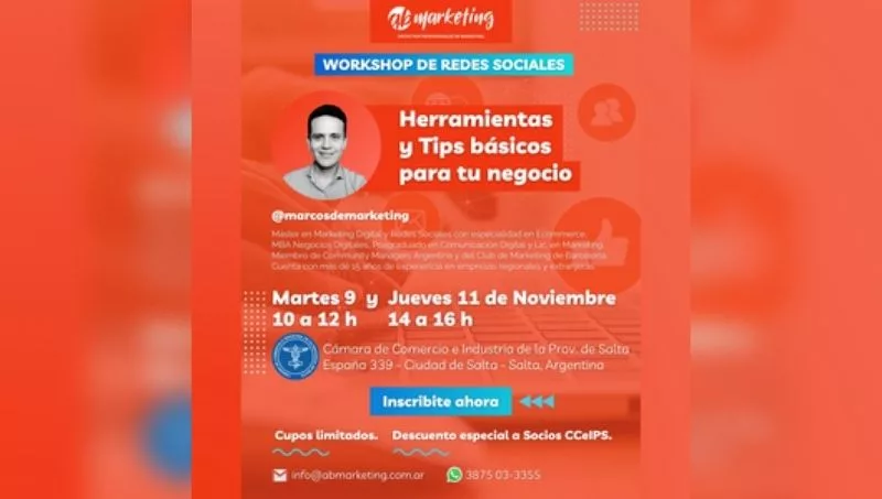 La Cámara de Comercio e Industria de Salta, convoca a sus asociados a participar de un del Workshop de redes sociales, el curso denominado "Herramientas y tips básicos para tu negocio" se realizará el mañana martes de 10 a 12 y el jueves de 14 a 16hs.
