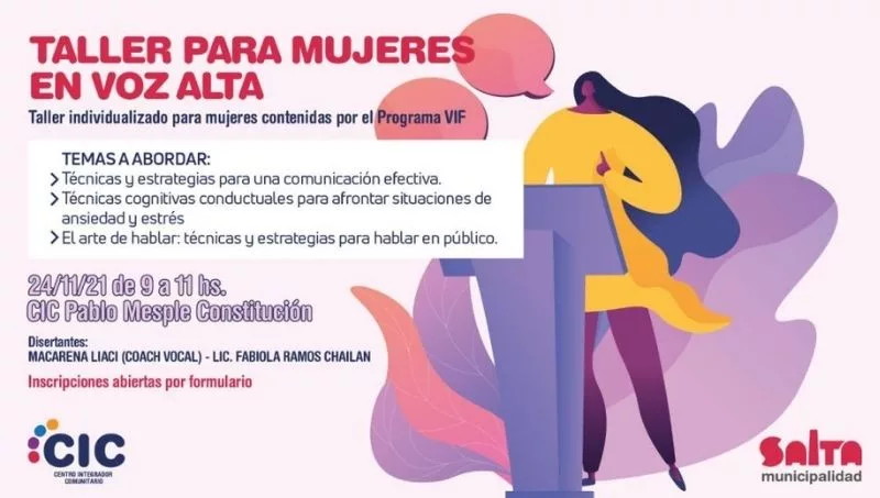 La Municipalidad nuevamente propone actividades para empoderar a la mujer y su familia. Para ello, la Subsecretaría de la Mujer brindará un taller de comunicación denominado “En voz alta” para compartir herramientas con quienes deben pasar por un proceso legal, judicial y de separación por problemática de género y familiar.