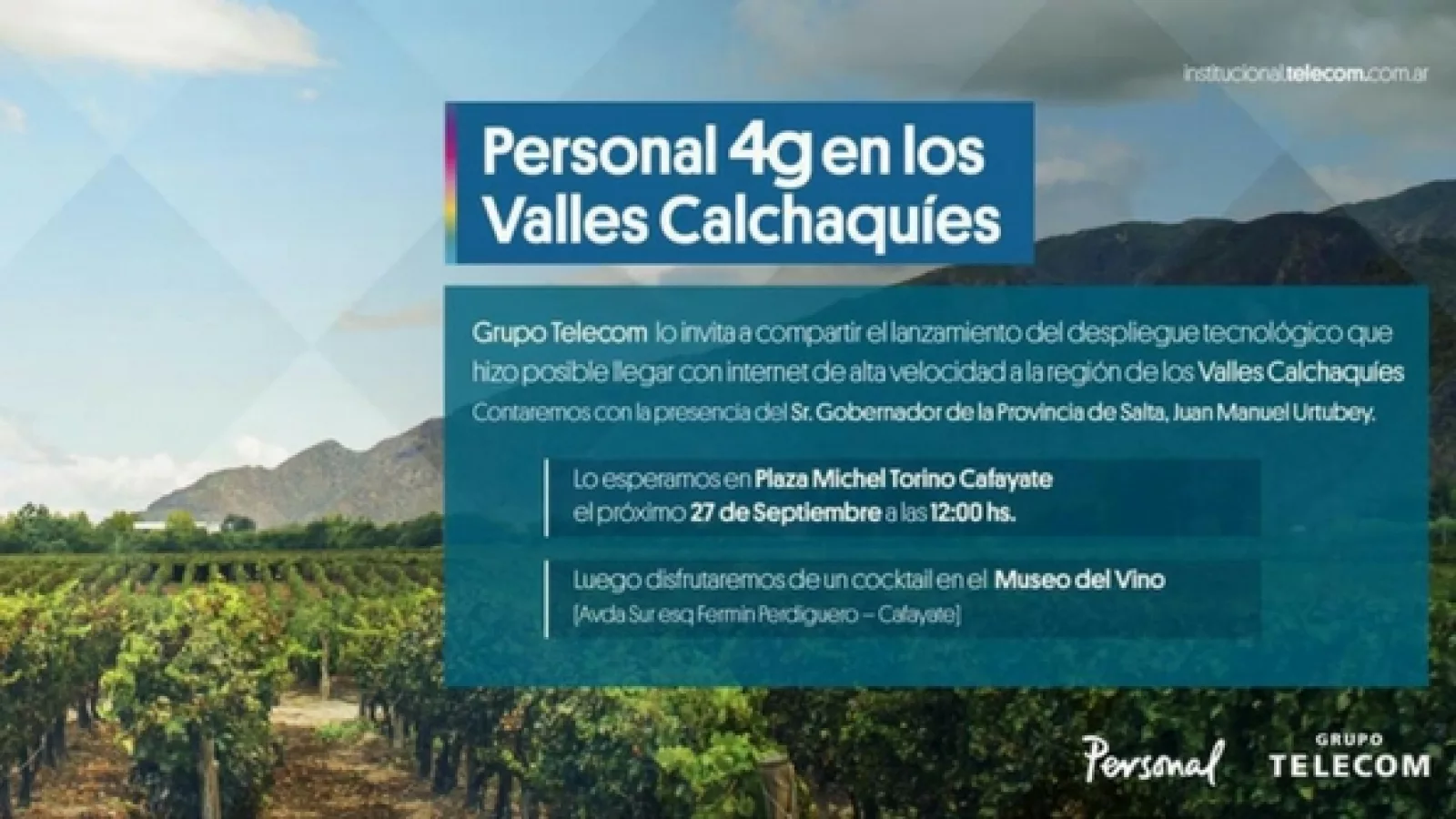 El acto tendrá lugar en la Plaza Michel Torino de Cafayate, hoy miércoles 27 a las 12. Luego se realizará un cocktail en el Museo del Vino (Avda. Sur esquina Fermín Perdiguero). Así, la red 4G de Personal continúa creciendo y ya son más de 8 millones los clientes aptos para utilizar el servicio en más de 980 localidades del país y en todas las capitales de provincia.