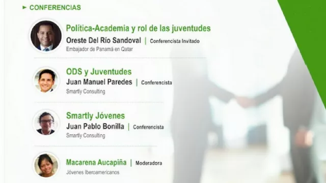 Sobre política, academia y rol de las juventudes disertará el embajador de Panamá en Qatar, Oreste del Río Sandoval. Los Smarttly Consulting Juan Manuel Paredes y Juan Pablo Bonilla disertarán sobre ODS y juventudes y smarttly jóvenes.