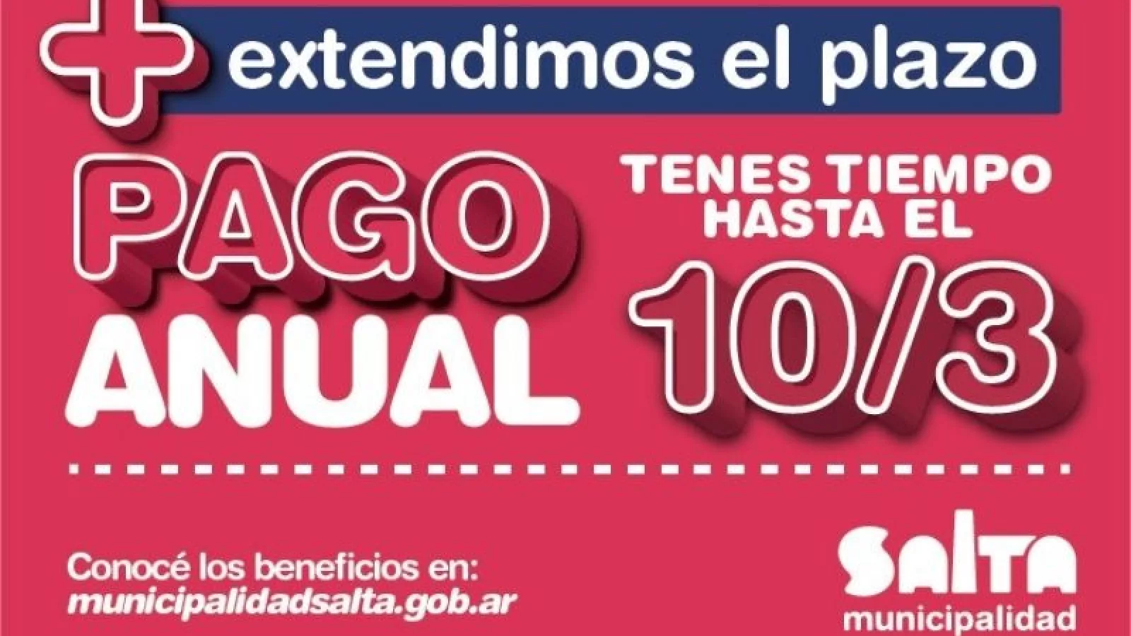 A raíz de la alta demanda para el Pago Anual de los impuestos, la Municipalidad de Salta decidió extender el plazo hasta el 10 de marzo, permitiendo así que más vecinos accedan a los beneficios que ofrece este sistema de pago adelantado de los tributos. “Los múltiples beneficios que ofrece este año el Pago Anual generaron que más vecinos se interesaran, pero entendemos que las limitaciones para el pago e impresión de boletas por los protocolos COVID impidieron que algunos pudieran adherirse”, explicó el director Ejecutivo de ARMSa, Rodolfo Paz Moya, para luego agregar que: “muchos contribuyentes pidieron a la Intendenta que diera una prórroga, y ella decidió otorgarla.”