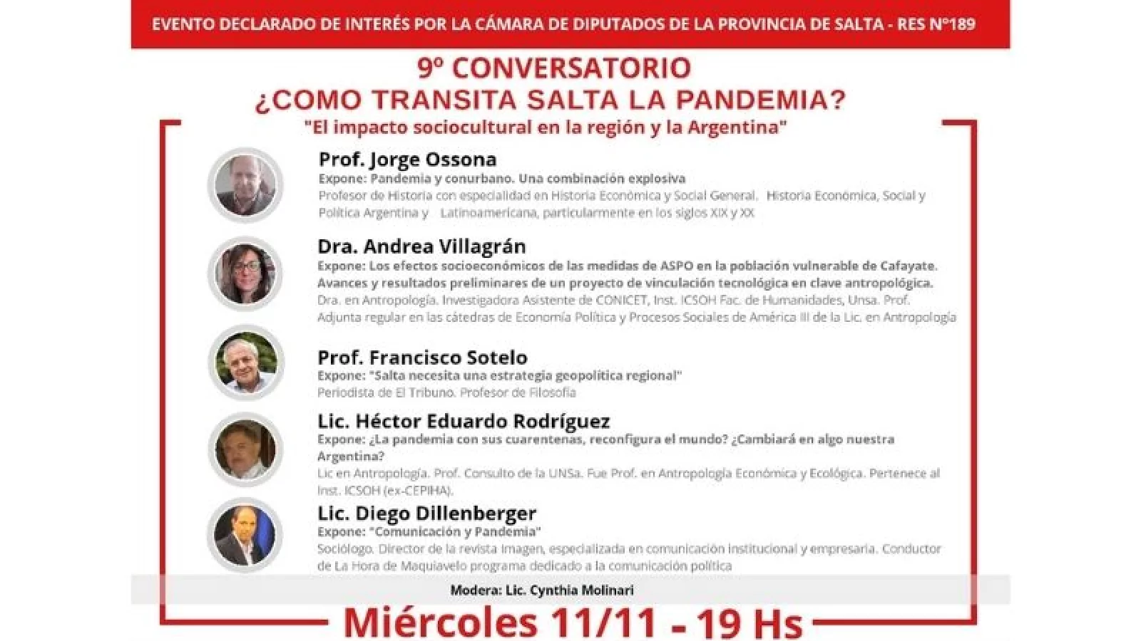 Luego el profesor Francisco Sotelo, expondrá sobre el tema: “Salta necesita una estrategia geopolítica regional”. Y el licenciado Héctor Eduardo Rodríguez, hablará sobre “La pandemia con sus cuarentenas, ¿reconfigura el mundo? ¿Cambiará en algo nuestra Argentina?”. Finalmente el licenciado Diego Dillenberger, expondrá sobre “Comunicación y Pandemia”.