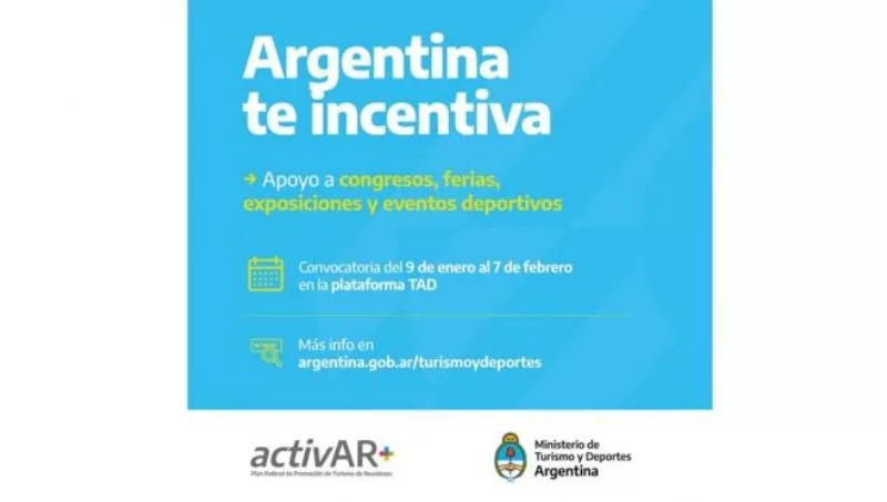 Los empresarios dedicados a los congresos, ferias, exposiciones y eventos deportivos y con proyectos para este año, podrán inscribirse en el programa “Argentina te incentiva”, que se realiza en el marco del Plan Federal de Turismo de Reuniones Activar+, hasta el 7 de febrero próximo. Lo pueden hacer a través de la plataforma TAD.