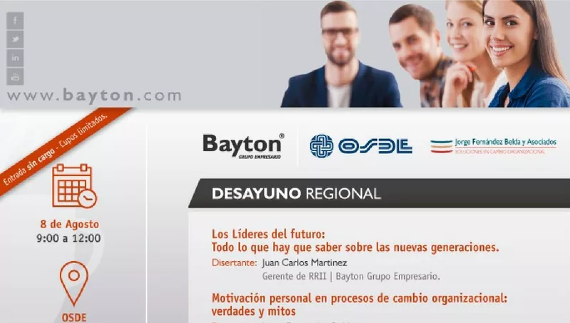 El Grupo Empresario Bayton se ha ganado en Salta un nombre importante en materia de Recursos Humanos. Y para consolidar ese espacio, cada año realiza un Desayuno Regional, en el que convoca a empresarios y especialistas en la materia para escuchar a disertantes de jerarquía, que marcan tendencia en esta disciplina.