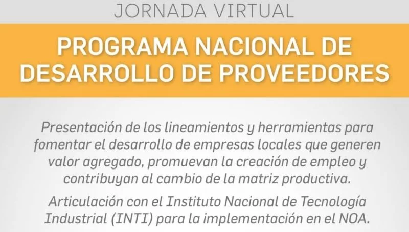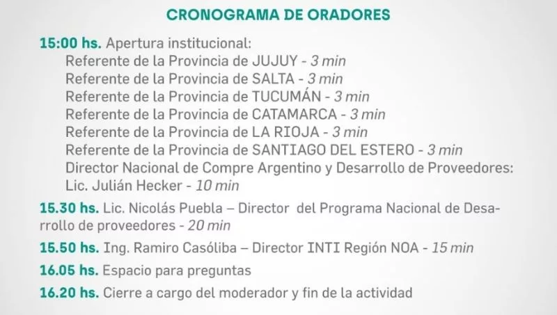 Organiza el Consejo PyME del NOA, junto al Ministerio de Desarrollo Productivo (Nación); Ministerio de Desarrollo Económico y Productivo (Jujuy); Ministerio de Industria, Comercio y Empleo (Catamarca); Ministerio de Trabajo, Empleo e Industria (La Rioja); Ministerio de Producción y Desarrollo Sustentable (Salta); Ministerio de Desarrollo Productivo (Tucumán); Ministerio de Producción (Santiago) y el Instituto Nacional de Tecnología Industrial (INTI).