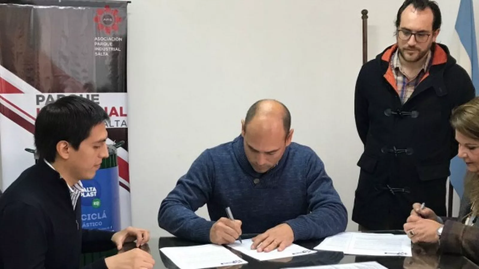 De la firma del convenio participaron Leonardo Júarez, presidente de la Asociación Parque Industrial Salta; Mónica Zannier, presidente de la Fundación CeoSol; y Maximiliano Pericón, gerente de Salta Plast.
