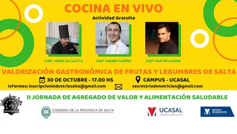 Se trata de un evento totalmente gratuito, que requiere inscripción previa. Contará con diversos espacios de formación e incluso una degustación gastronómica y una valorización de frutas, verduras y legumbres salteñas. Además, tres reconocidos chefs internacionales cocinarán en vivo y expondrán diferentes métodos de cocción para mantener el valor nutricional de los alimentos. Los interesados en participar de la jornada, podrán inscribirse enviando sus datos a las casillas de correo electrónico (aquí y aquí)