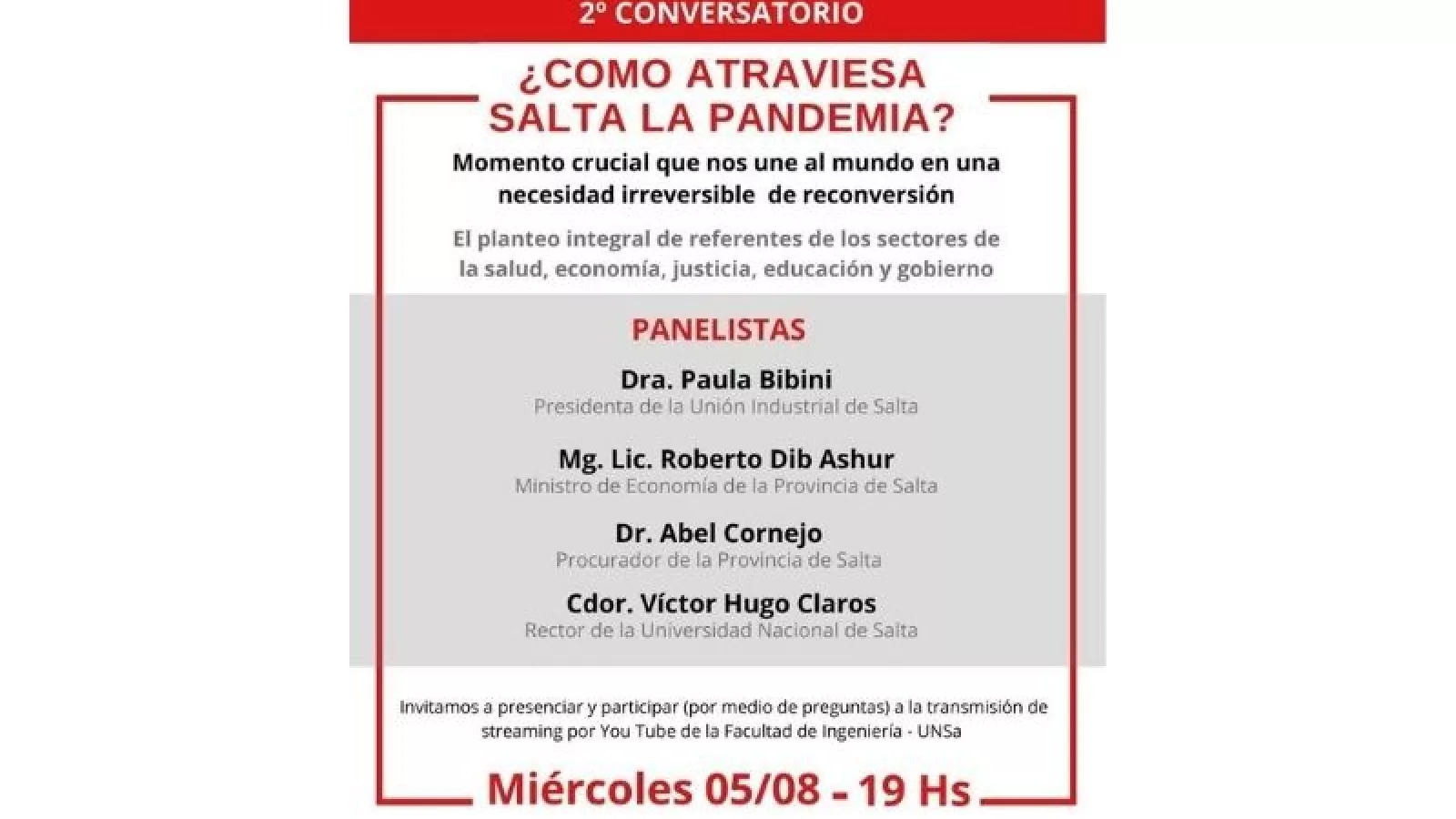 Para el webinario de mañana están convocados como disertantes Paula Bibini, presidenta de la Unión Industrial de Salta; Roberto Dib Ashur, ministro de Economía de la provincia; Abel Cornejo, Procurador de la provincia; y Víctor Hugo Claros, rector de la Universidad Nacional de Salta.