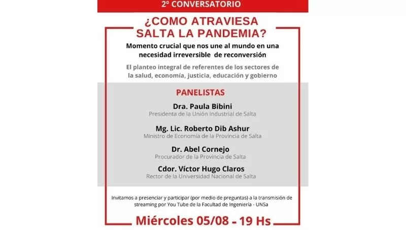 Los interesados en este espacio de análisis y reflexión están invitados a presenciar y participar (por medio de preguntas) de la transmisión de streaming por YouTube de la Facultad de Ingeniería de la UNSa, disponible en el link.