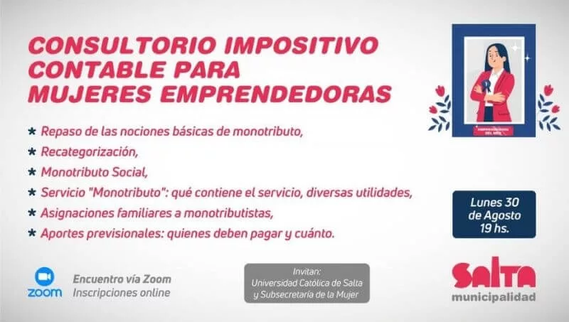 La Municipalidad de Salta invitó a participar de un nuevo encuentro del Consultorio Impositivo para mujeres emprendedoras que se realizará hoy lunes 30 de agosto a las 19 vía Zoom.