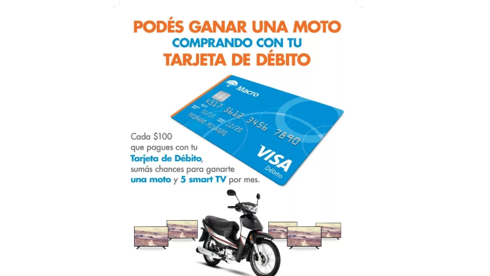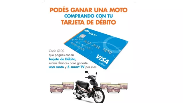 La campaña es clara: los clientes de Banco Macro que utilicen su tarjeta de débito hasta el próximo 30 de noviembre, participarán del sorteo de tres motos y quince Smart TV. La campaña, que busca promover el uso de las tarjetas de débito por sobre el dinero en efectivo, continúa vigente y cada 100 pesos que sus clientes paguen con su Visa Débito de Banco Macro, suman una chance para el concurso