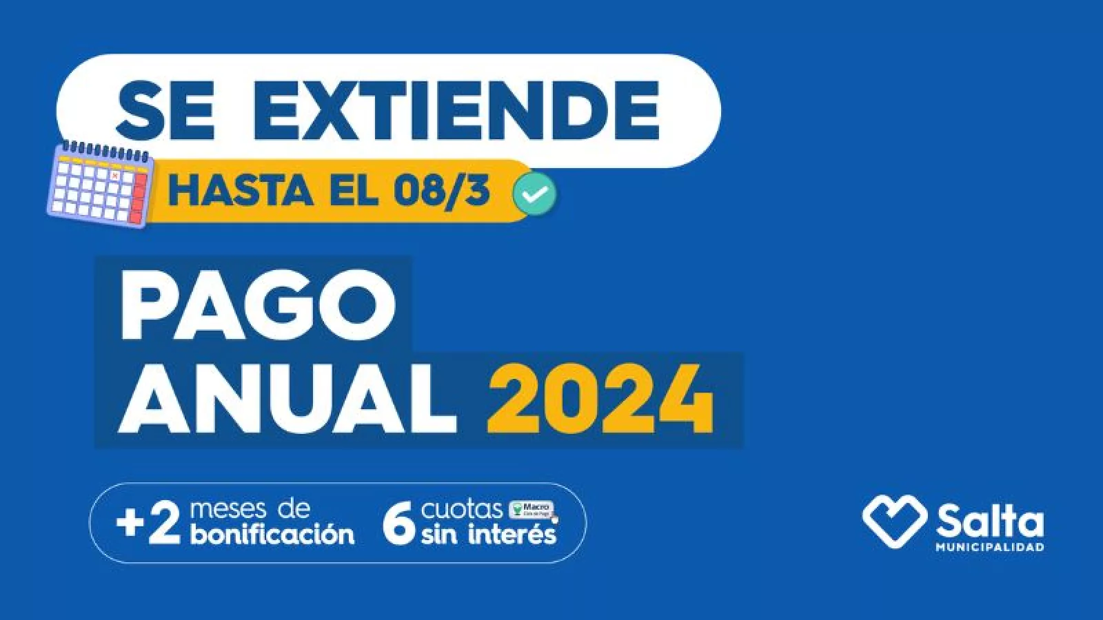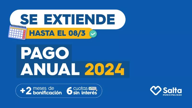 La Municipalidad de Salta informó ayer que el Pago Anual de Tributos Municipales 2024 se prorrogará hasta el viernes 8 de marzo. De esta manera los contribuyentes tendrán dos semanas más para acceder a la bonificación de dos meses y el pago en 6 cuotas sin interés con tarjeta de crédito del Banco Macro; o el 12% de descuento sobre el total a pagar con otras tarjetas de crédito.