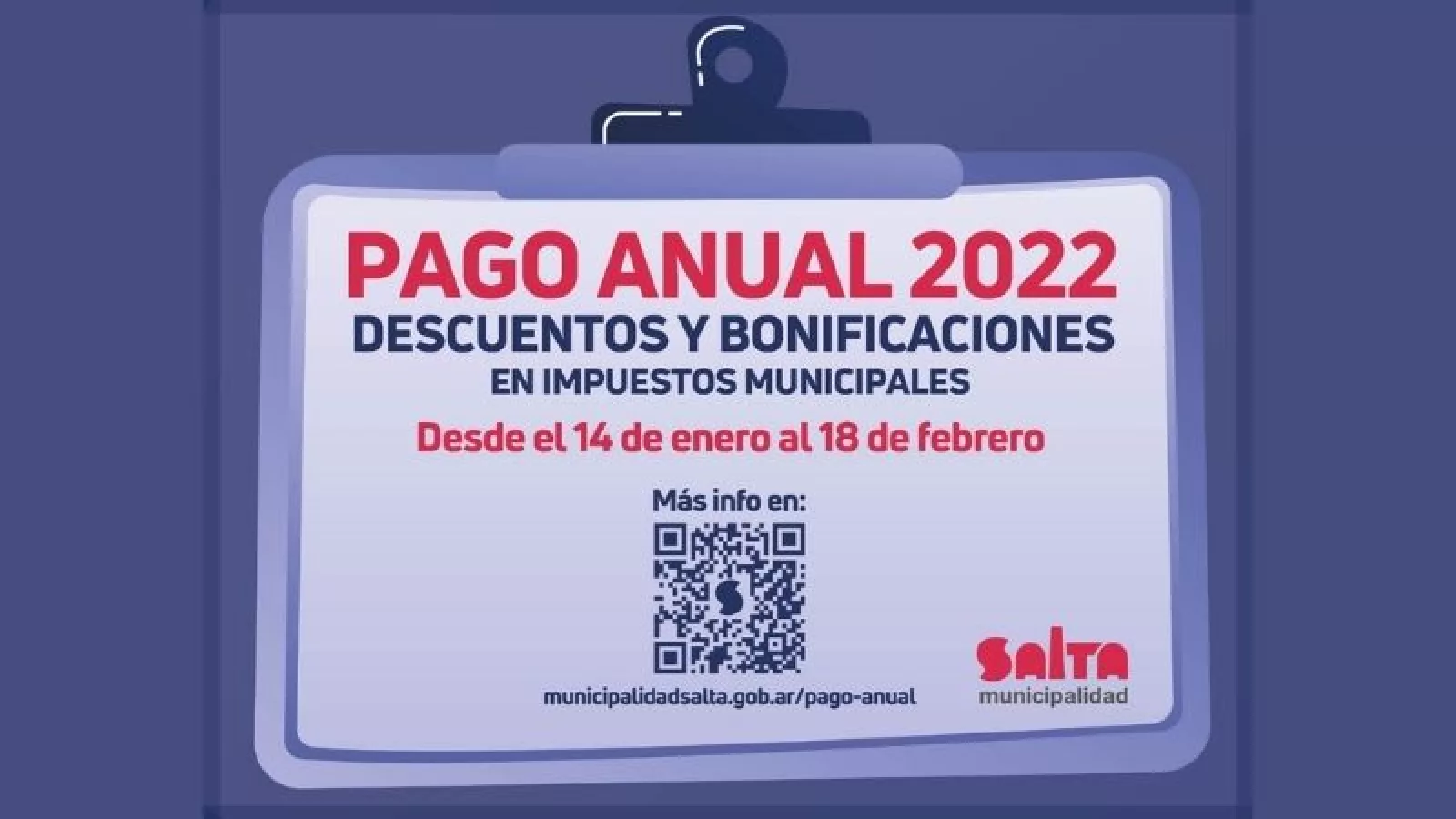 La Agencia de Recaudación de la Municipalidad de Salta (ARMSa) pondrá en vigencia desde este viernes 14 de enero el Pago Anual de tributos municipales 2022. Este programa de incentivo al pago por adelantado, tiene importantes beneficios de descuento, aplicables al Impuesto Inmobiliario, Tasas General de Inmuebles, Impuesto Automotor y Tasa de Protección Ambiental.
